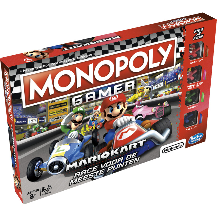 Bij deze opvolger slaan Monopoly en Mario Kart de handen in elkaar voor het Monopoly Gamer Mario Kart-bordspel! Speel als Mario, Princess Peach, Luigi of Toad en koop legendarische Mario Kart-eigendommen, zoals Bowser's Castle en Rainbow Road. Kom langs Start om een Mario Kart Cup-race te starten, ontwijk bananenschillen, gooi schilden en verzamel munten. Het Super Star-vakje activeert speciale krachten en als je de Power-Up dobbelsteen gooit krijg je een speciale boost. Om dit spel te winnen moet je als eerste finishen!Uitverkocht
