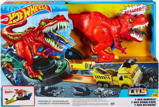 Laat je woeste kant zien in de strijd met Hot Wheels™ City Razende T-Rex! Hot Wheels™ City wordt aangevallen door een gigantische T-Rex en jij moet ons helpen! T-Rex komt tot leven met geluiden en gemotoriseerde bewegingen, en jij bent de enige die hem kan verslaan en de stad kan redden! Lanceer je auto in de richting van de draaiende dinosaurus en knal hem omver voordat hij de gebouwen van de stad neermaait. Maar wees voorzichtig! Als je de dinosaurus mist, is de kans groot dat je in de maag van een hongerige T-Rex verdwijnt!Uitverkocht